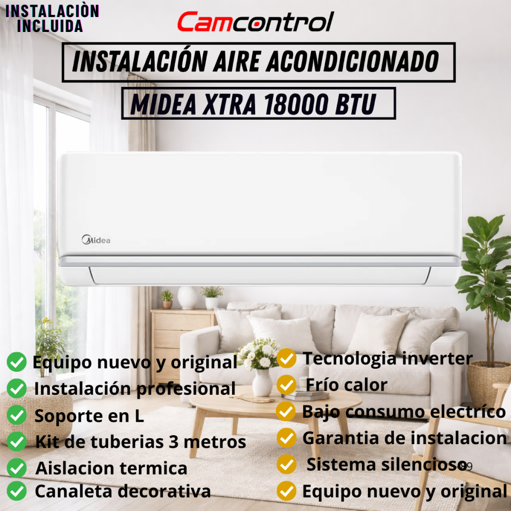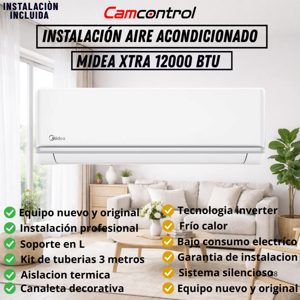 Servicio de instalación + aire Acondicionado Midea Breezeless 12.000 BTU Inverter con control Wi-Fi e instalación profesional incluida. Servicio completo de venta y montaje de este modelo con climatización sin brisa directa, control desde celular y eficiencia energética avanzada. Ideal para espacios medianos y amplios con confort todo el año, instalación profesional Camcontrol, canaletas y puesta en marcha incluidas.