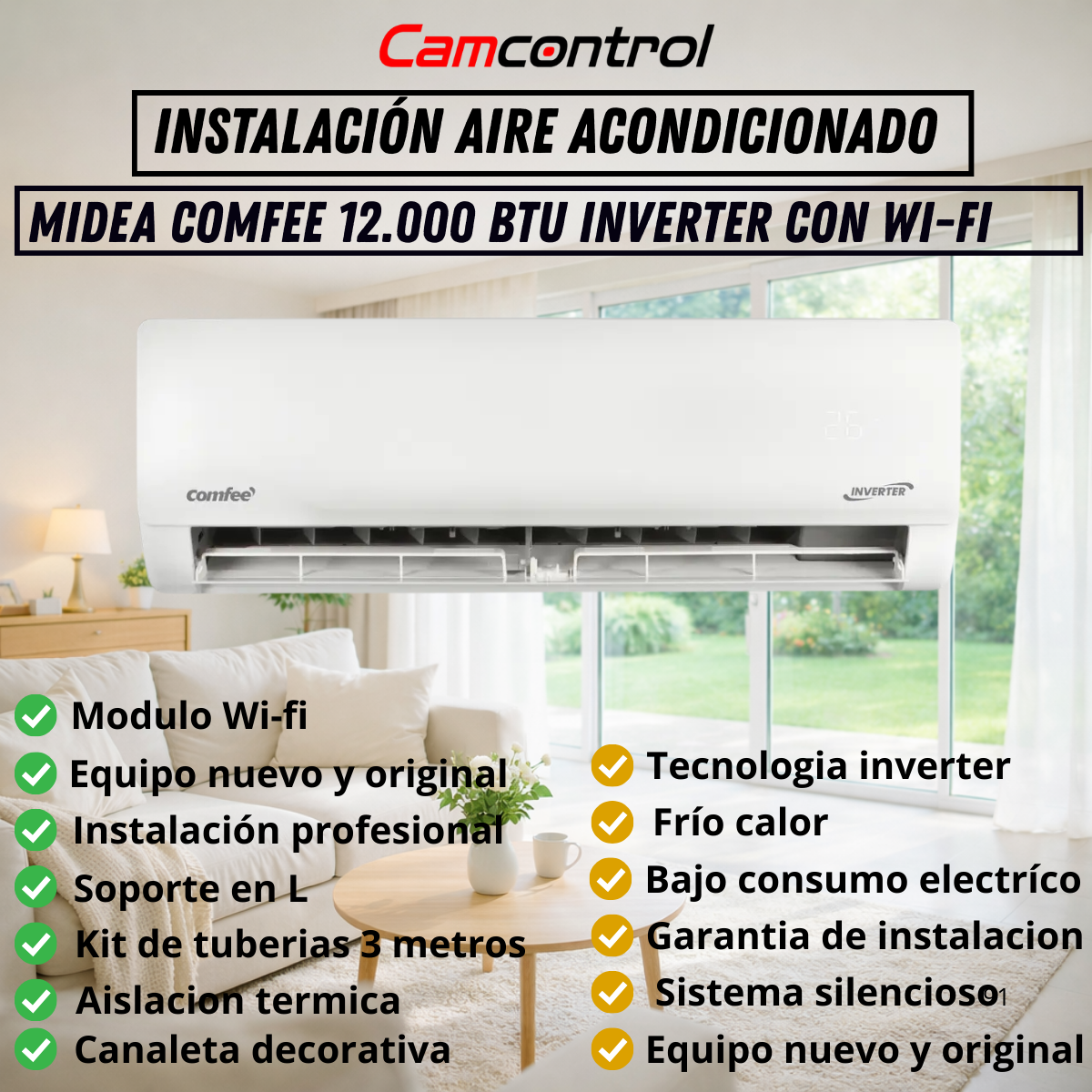 En Camcontrol te ofrecemos el servicio completo de venta e instalación profesional del aire acondicionado Comfee 12.000 BTU Split Inverter, una opción moderna y eficiente para climatizar tus ambientes con confort y bajo consumo eléctrico.
